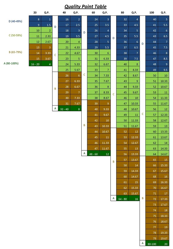 GPA/ CGPA = SUM OF QUALITY POINTS / SUM OF THE CREDIT HOURS - The quality points table given below will be used for calculating the GPA/CGPA: